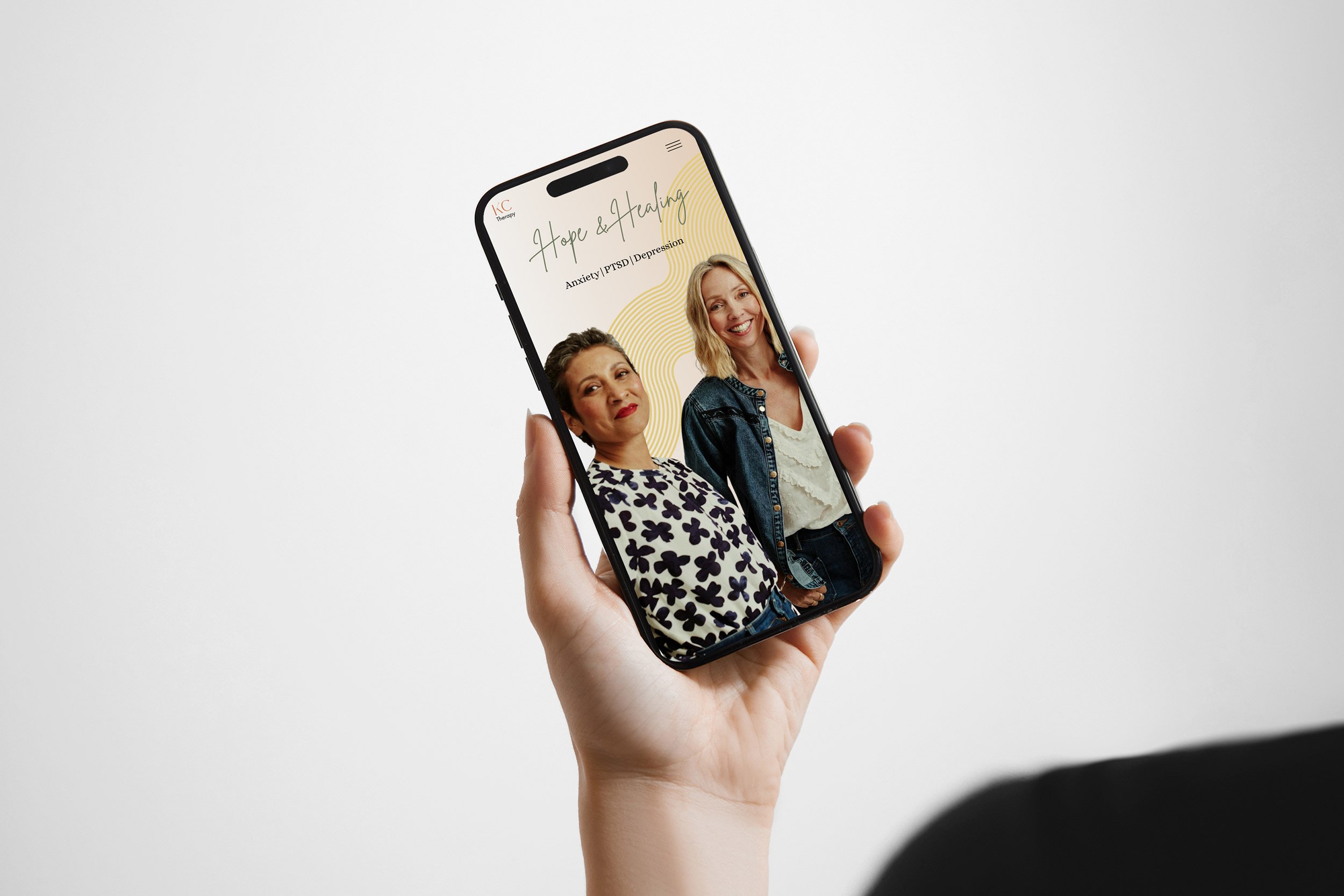 A hand holding a smartphone displaying a therapy website called 'Hope & Healing' with images of two women and text mentioning anxiety, PTSD, and depression.