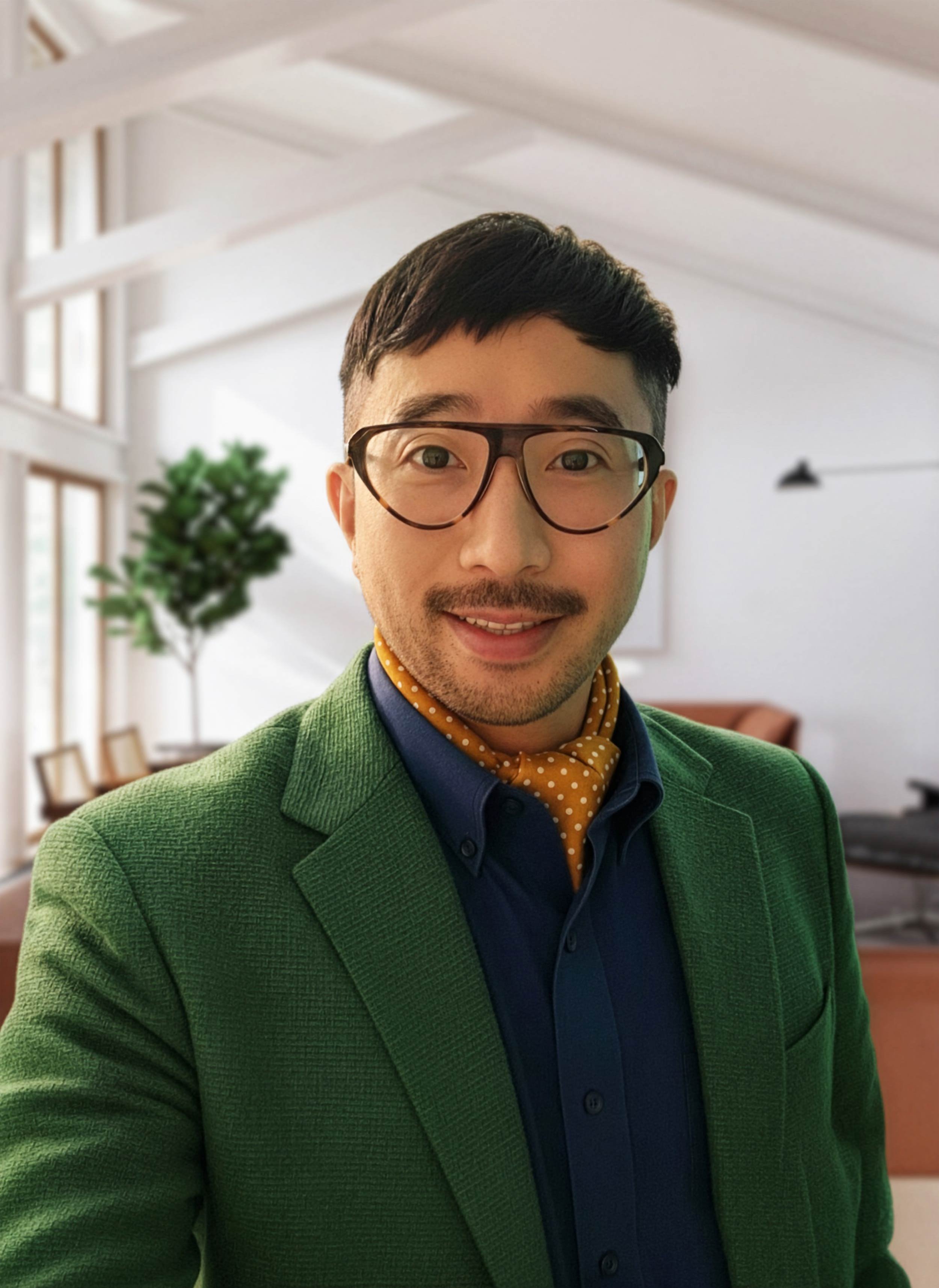 A designer wearing glasses, a green blazer, a navy blue shirt, and a yellow polka dot scarf, taking a selfie in a modern, bright living room with large windows, a green plant, and minimalist furniture.